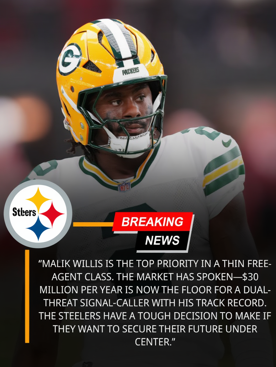 🚨BREAKING: The Pittsburgh Steelers' quest for a new QB just got a massive price tag. With Aaron Rodgers' future uncertain, free-agent target Malik Willis is reportedly commanding a whopping $30M per year. Pittsburgh must decide if the former Packers backup is worth the record-setting investment.👇